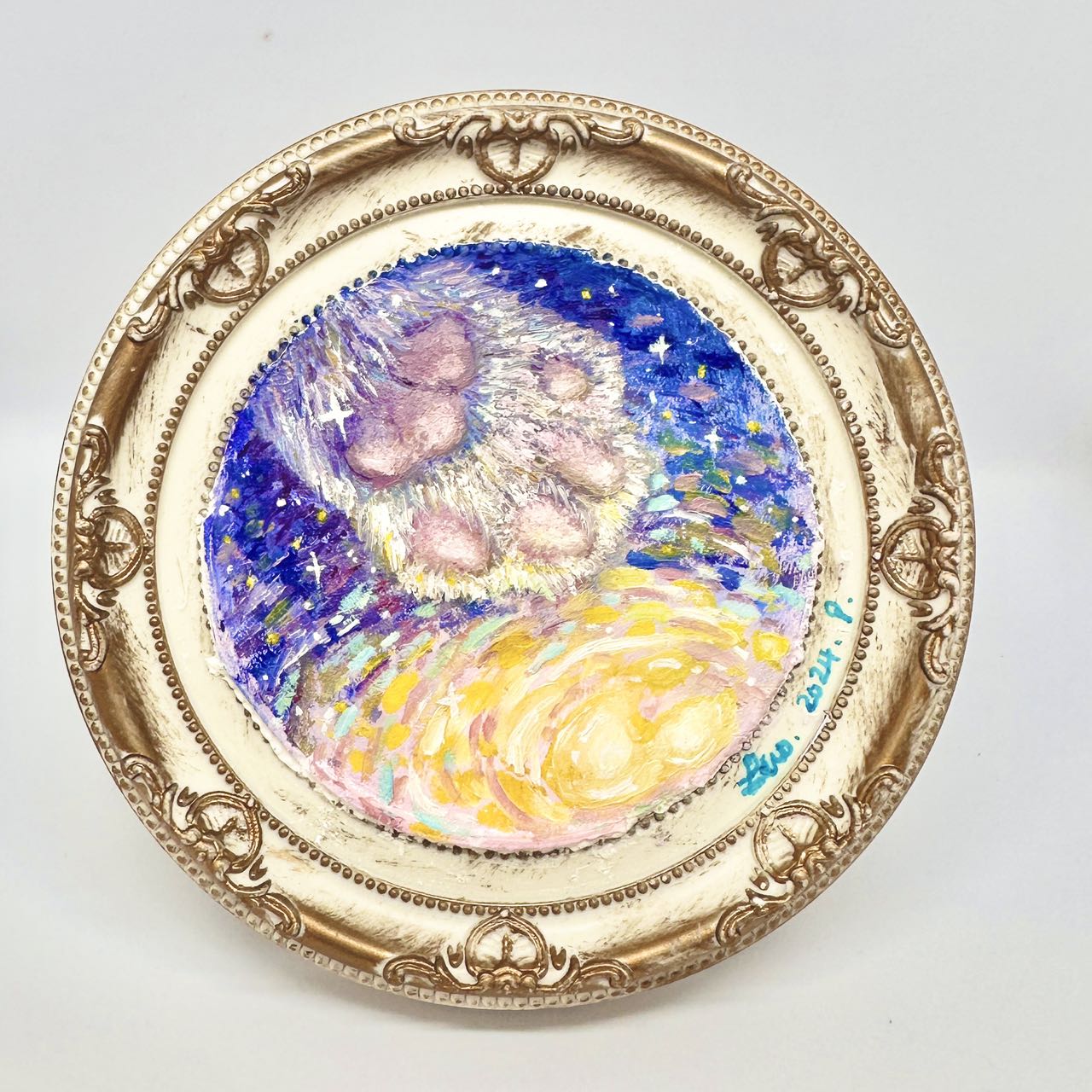 猫のような感受性と好奇心を持ち、クリエーションで生きた知覚を探求する。油絵、石膏、 土、草花などを素材に、自然から生まれて、自然に帰り、死に向かって走り、そして生の希望を得る、生命のサイクルを記録する。忘れられるのが怖いから、生きた証をすべて残したいと考える。石膏で瞬間の記憶を凍らせ、油絵具で生命の色を復元する。バラのおかげで考え始め、猫のおかげで柔らかくなる。自然と猫をテーマにした作品は、生命の痕跡を記録している。